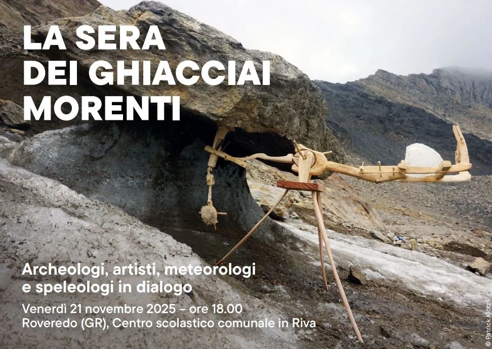 Venerdì 21 novembre, ore 18.00 a Roveredo (GR), Centro scolastico comunale in Riva: La sera dei ghiacciai morenti. Archeologi, artisti, meteorologi e speleologi in dialogo.